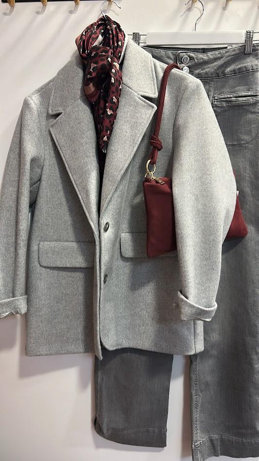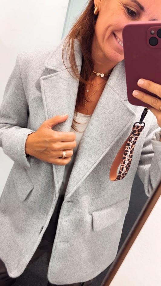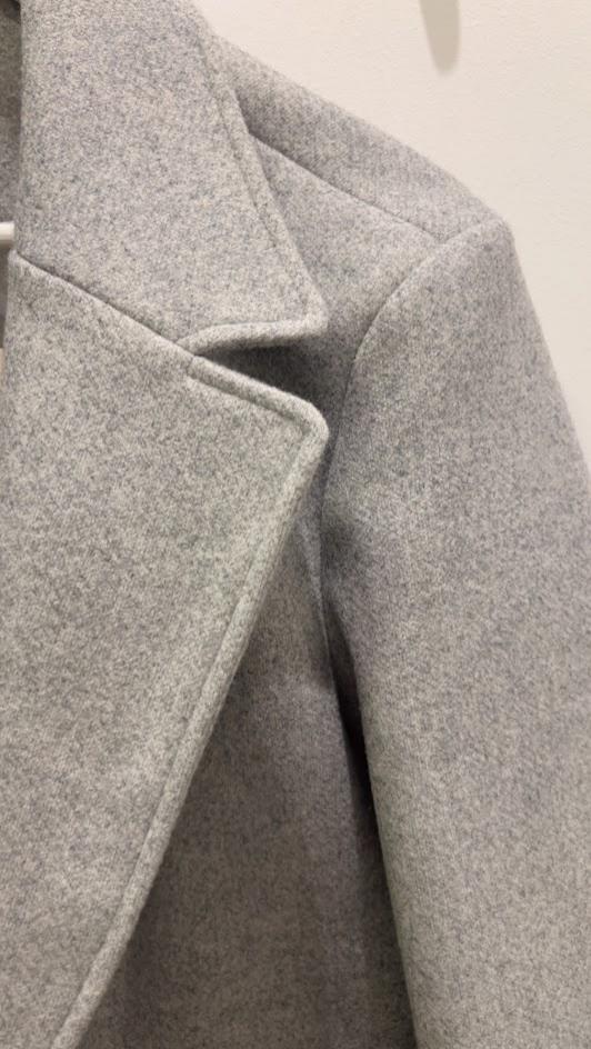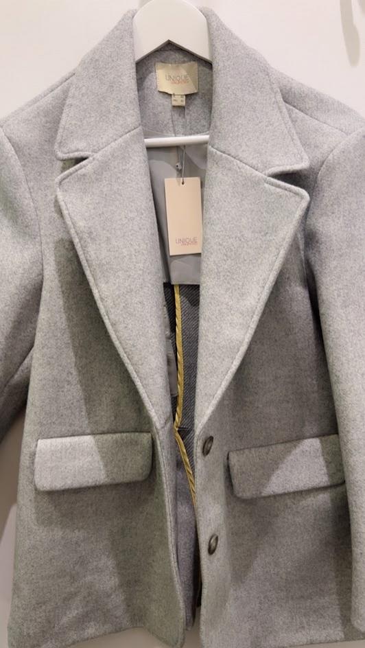 Chaquetón gris claro, cierre con botones. Solapa y bolsillos delanteros. Marca Unique.