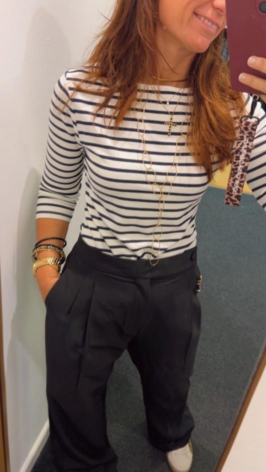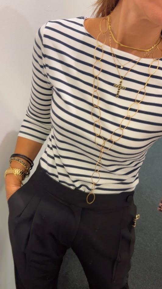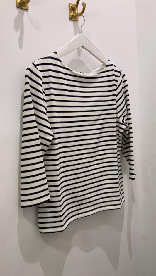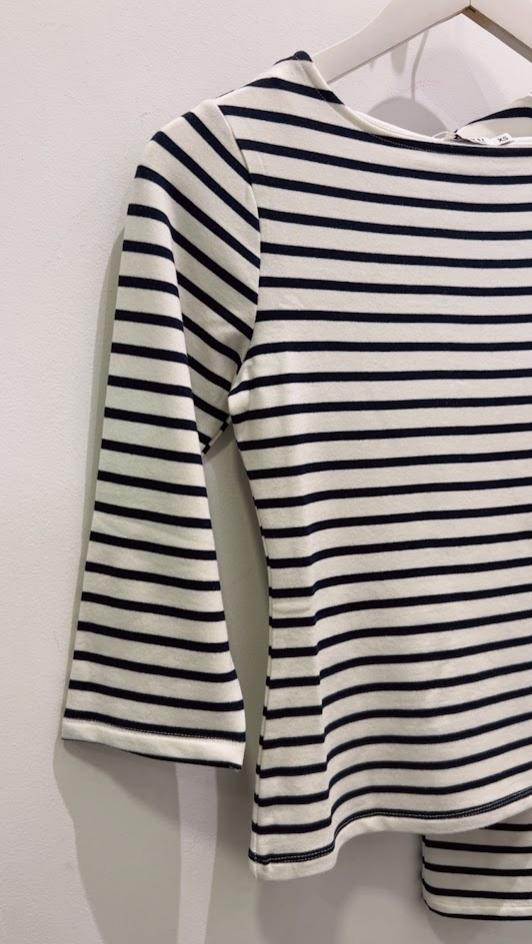 Camiseta tejido sudadera fina, blanca rayas negras, cuello redondo, manga 3/4. Corte entallado, tejido. Marca Tiffosi.