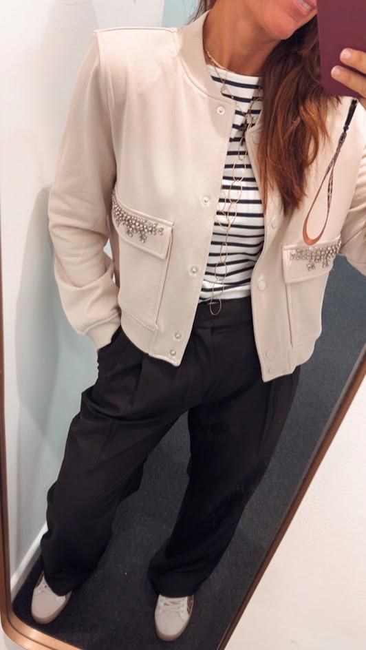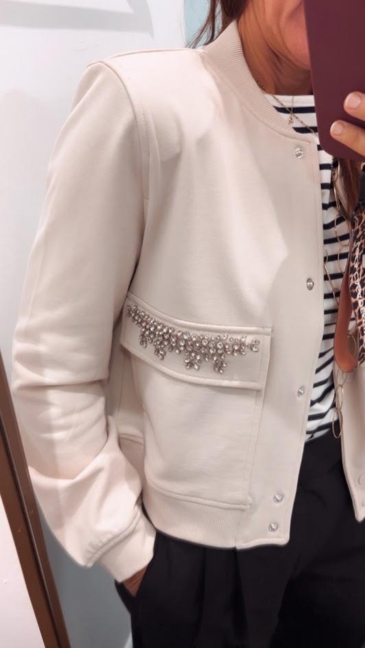 Bomber color beige, algodón, bolsillos delanteros con solapa joya. Cierre con botones automaticos. Marca Lola Casademunt.