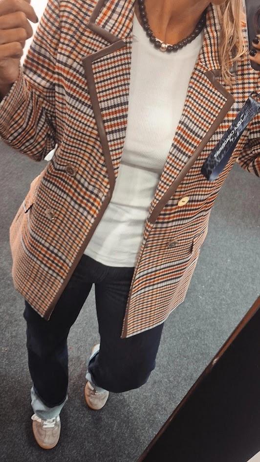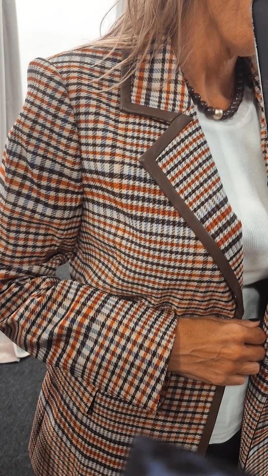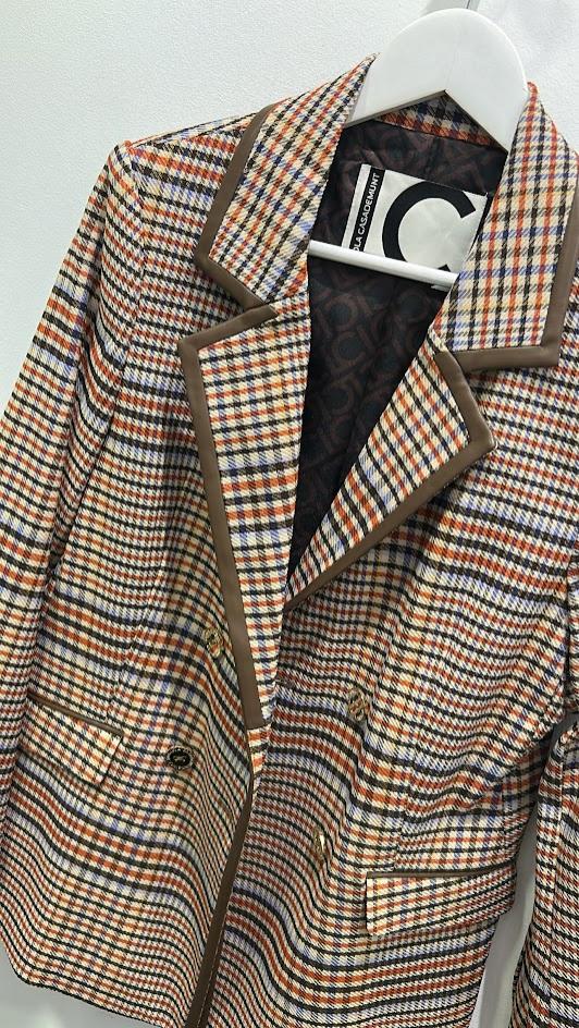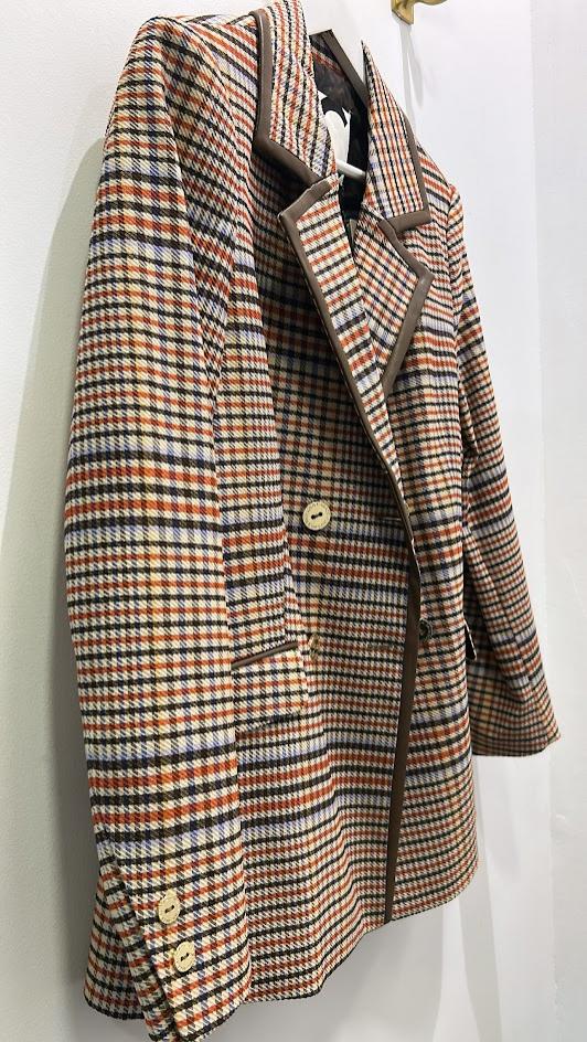 Americana cuadros en tonos marrones, lilas, naranjas. ribete contraste. Bolsillos con solapa. Forro interior con logo. Marca Lola Casademunt.