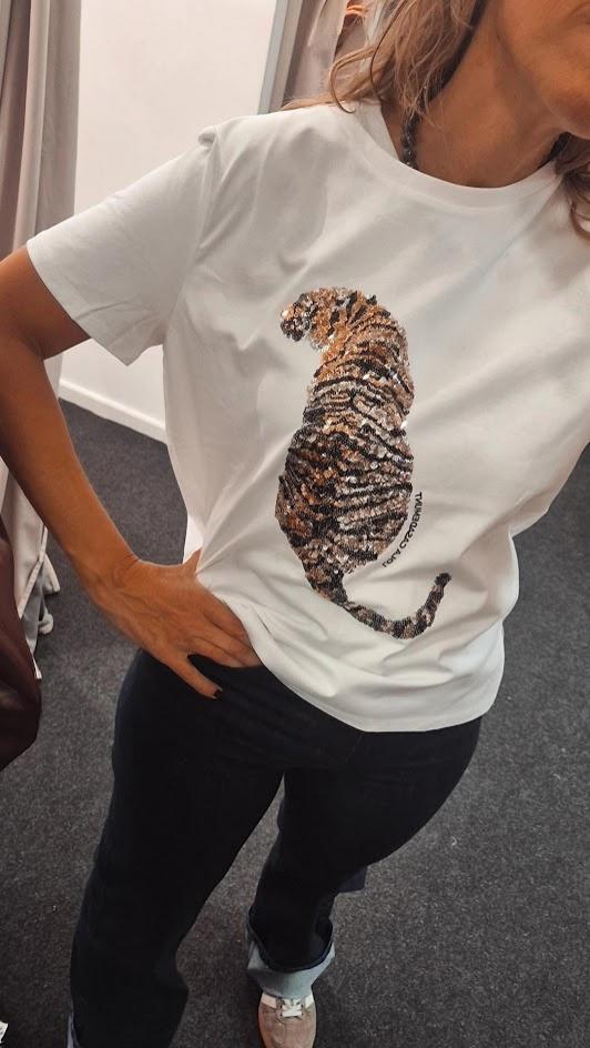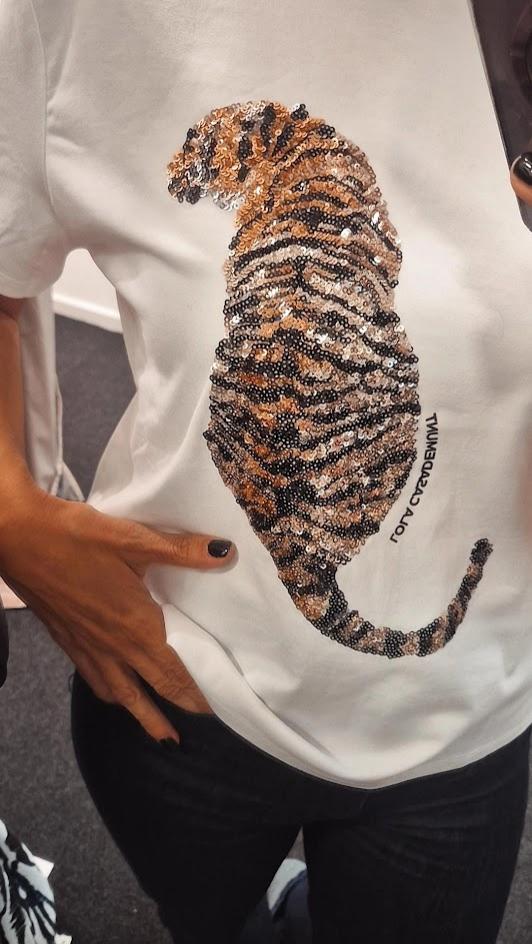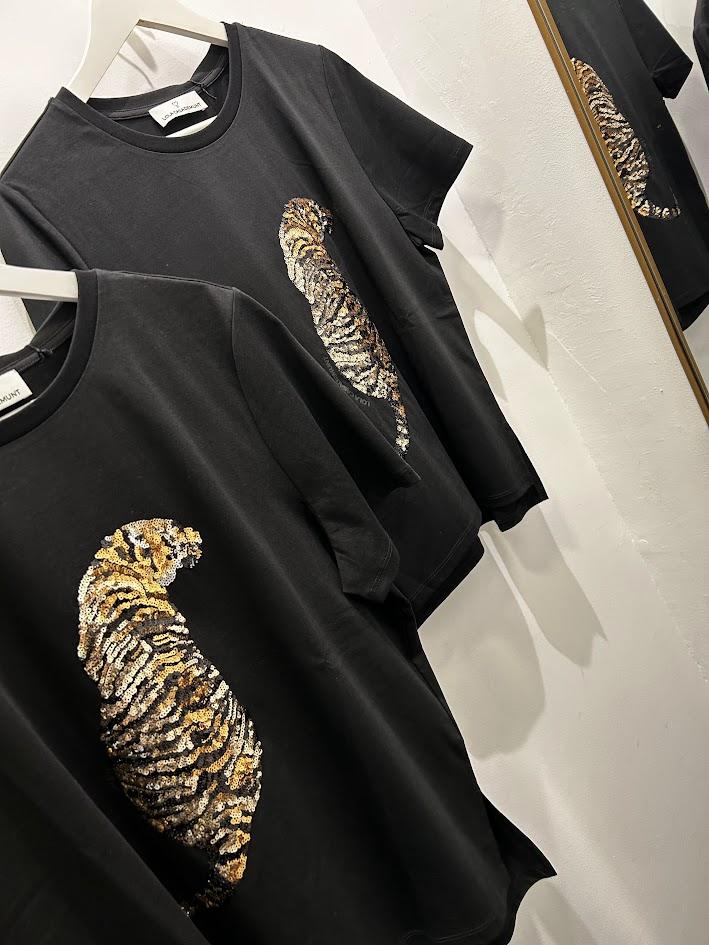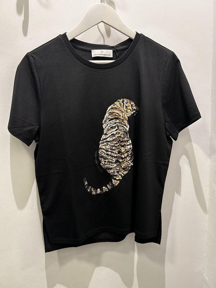 Camiseta algodón, manga corta, tigre con pedreria. Cuello redondo. Marca Lola Casademunt.