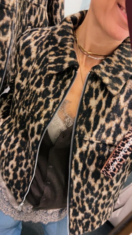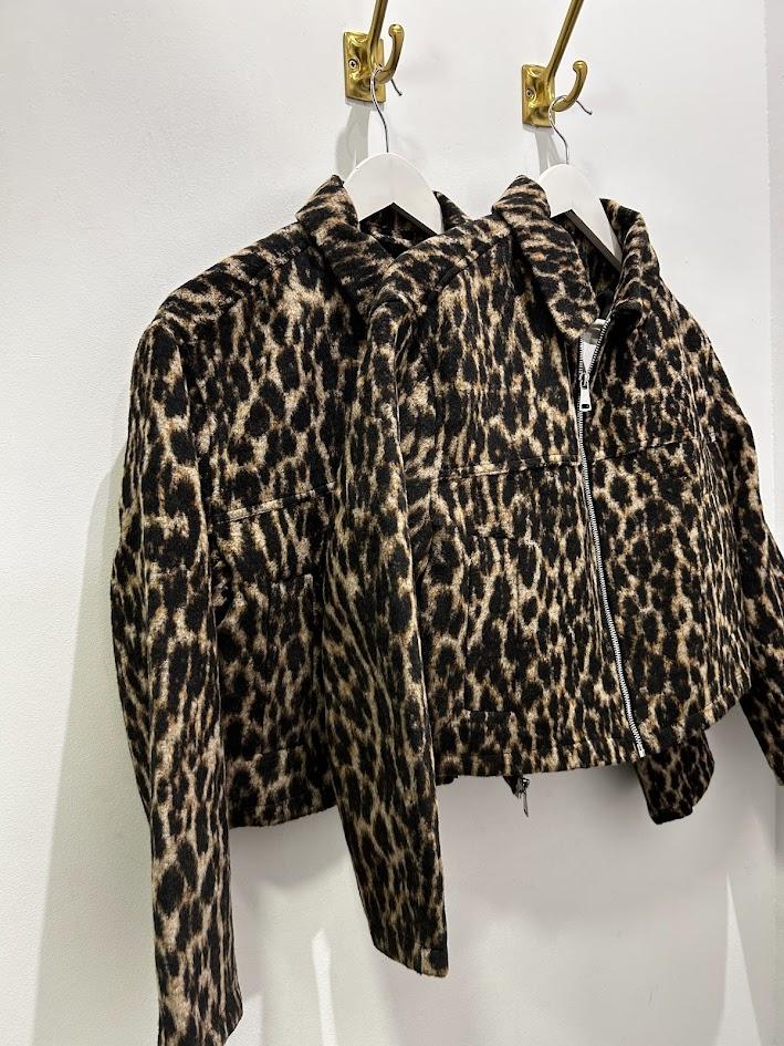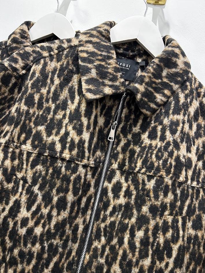 Abrigo relaxed fit con estampado animal print, dos bolsillos, cuello con solapa, cierre de cremallera y manga larga. Croped. Forro interior. Marca Tiffosi.