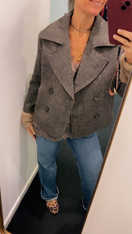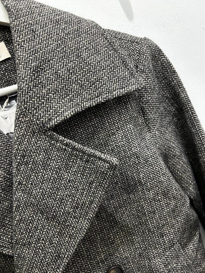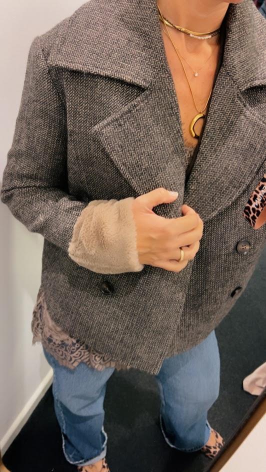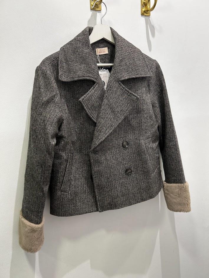 Abrigo corto con cuello de solapas, doble botonadura y bolsillos. Detalle de pelo en los puños. Marca Nekane.