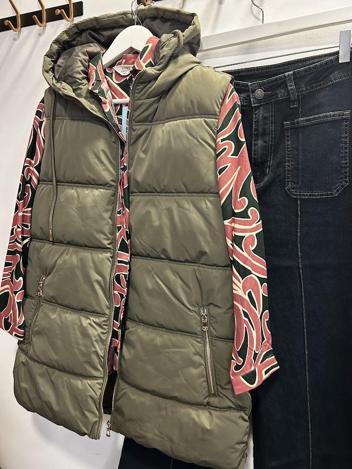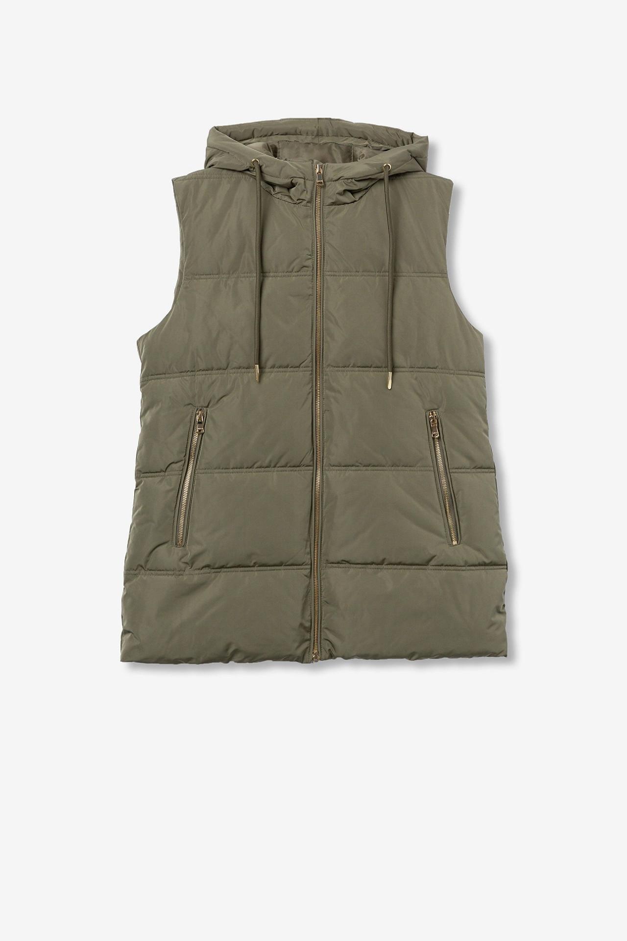 Chaleco acolchado relaxed fit con capucha ajustable. Cierre frontal de cremallera. Bolsillos laterales con cremallera. Marca Tiffosi.