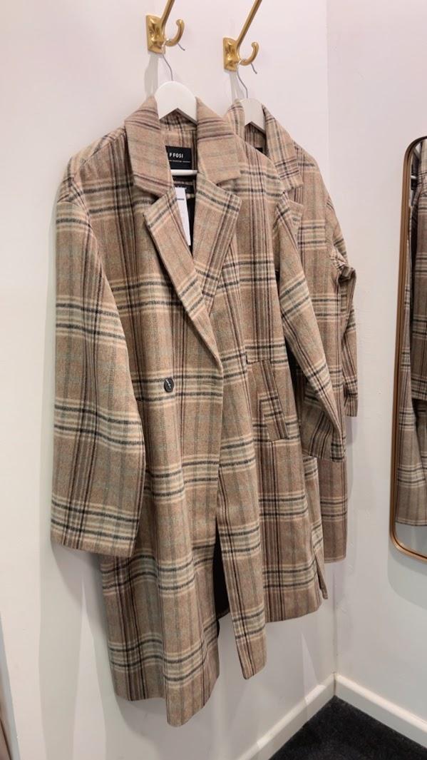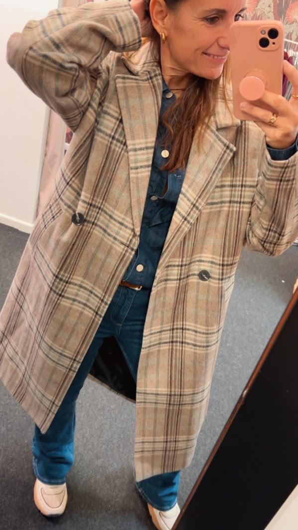 Abrigo largo relaxed fit, con estampado de cuadros y dos bolsillos frontales. Color beige, verde y gris. Cuello con solapa, manga larga, doble botonadura y cierre de botones.. Marca Tiffosi.