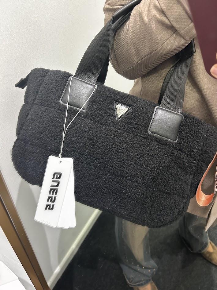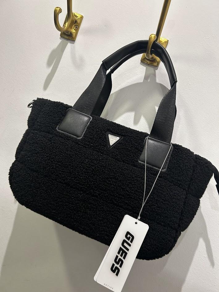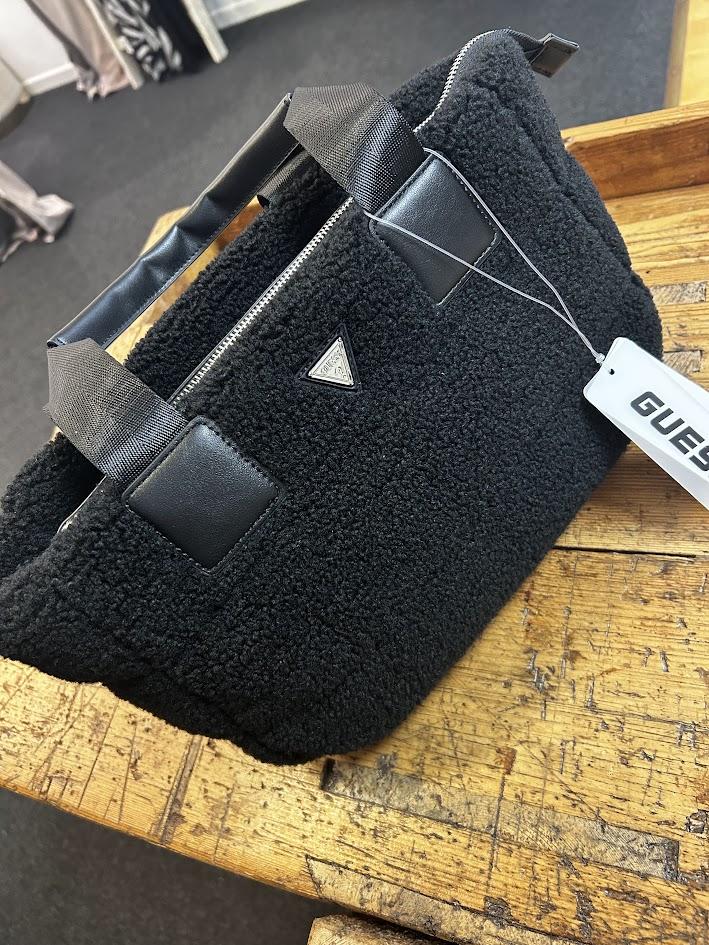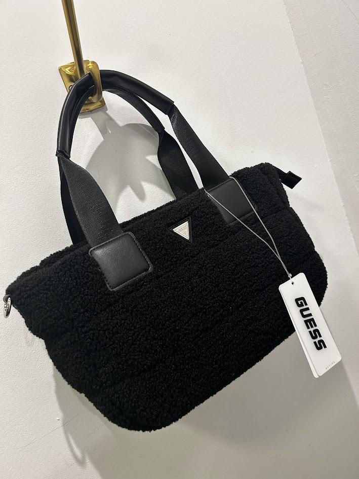 Bolso suave borreguito, color negro. TIras nylon y tira larga ajustable Forro y bolsillo interior. Cierre cremallera . Bolsillo interior. Marca Guess.