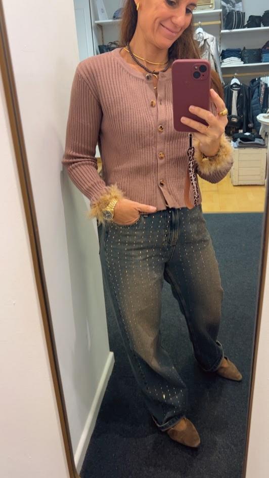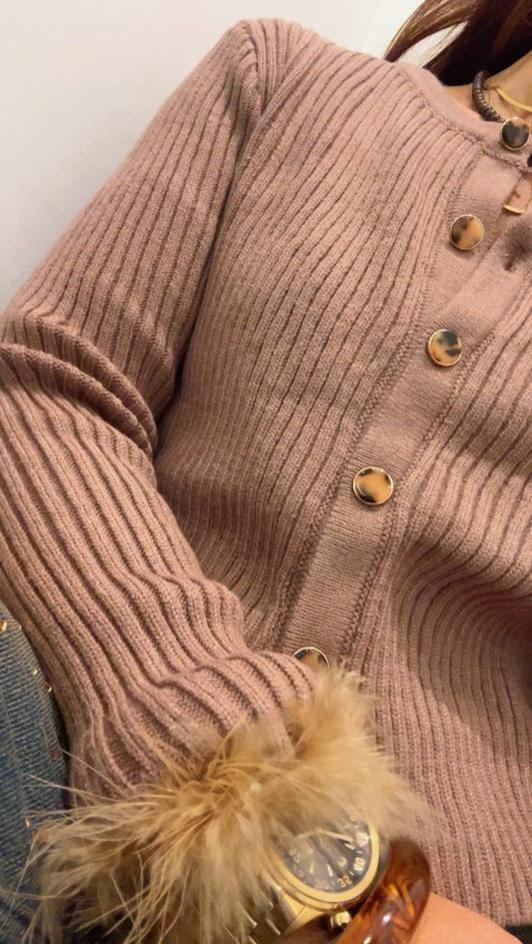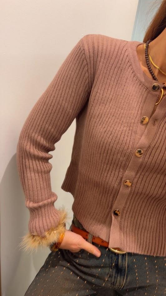 Cárdigan punto canalé con botonadura completa. Corte recto, cropped y cuello redondo. Detalle de pelo en puños. Marca Nekane.