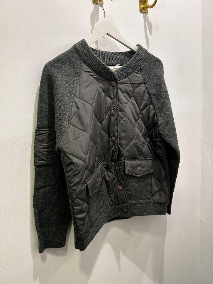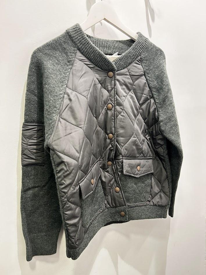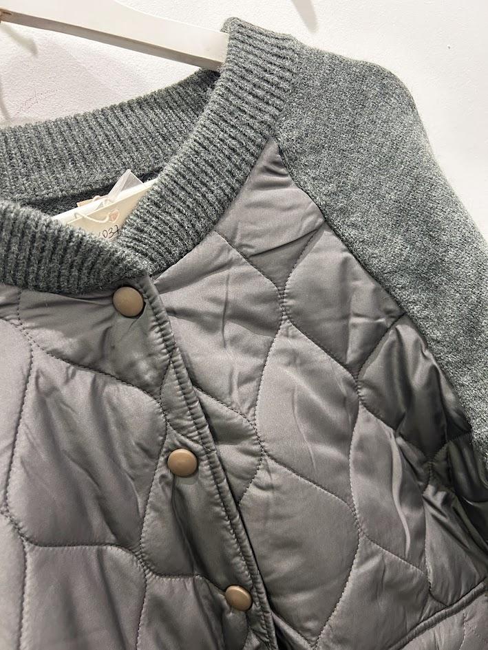Chaqueta bómber combinada en punto y tejido acolchado. Color kaki grisaceo. Bolsillos y botonadura completa frontal con botones de presión. Marca Nekane.
