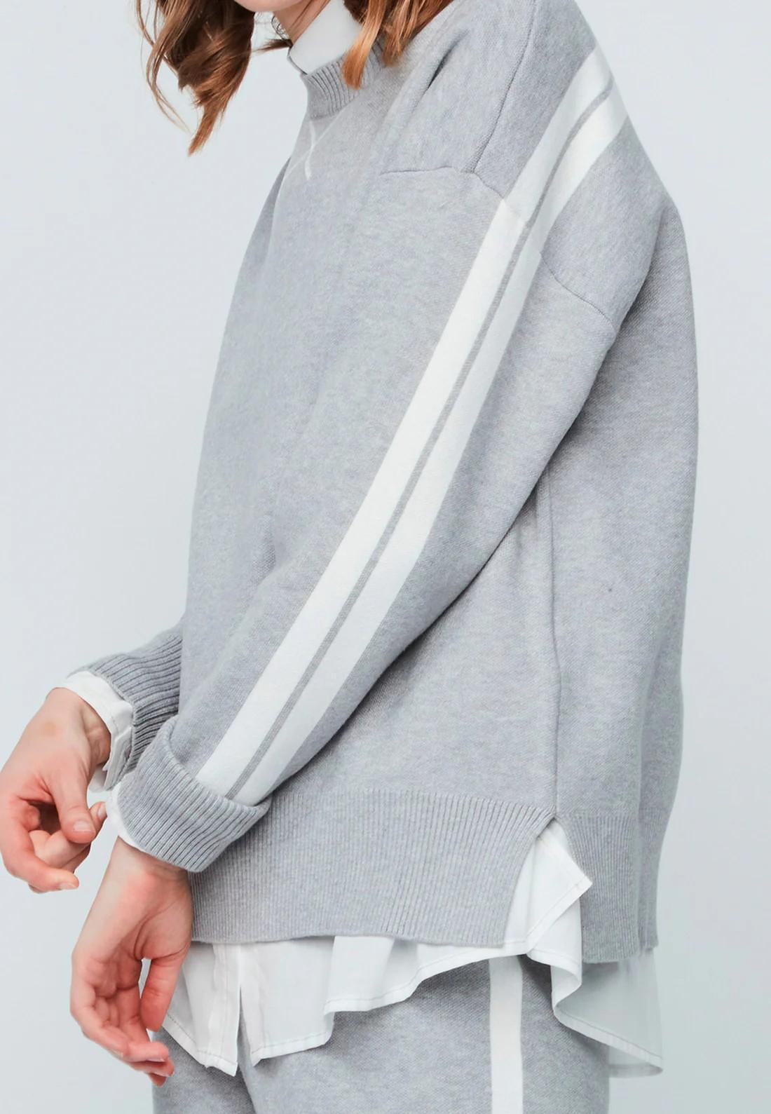 Sudadera confeccionada en punto suave con cuello redondo y detalle decorativo en el escote. Manga larga y bajo recto con aberturas laterales. Diseño minimalista con inspiración deportiva. Color gris combinado con detalles en blanco. Marca Unique.