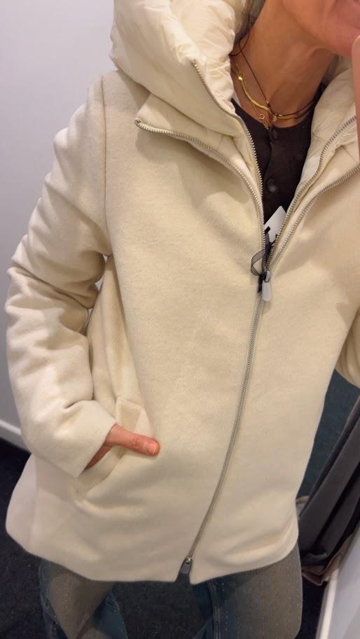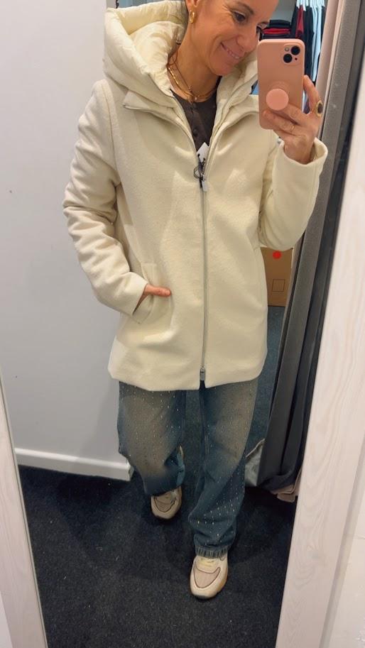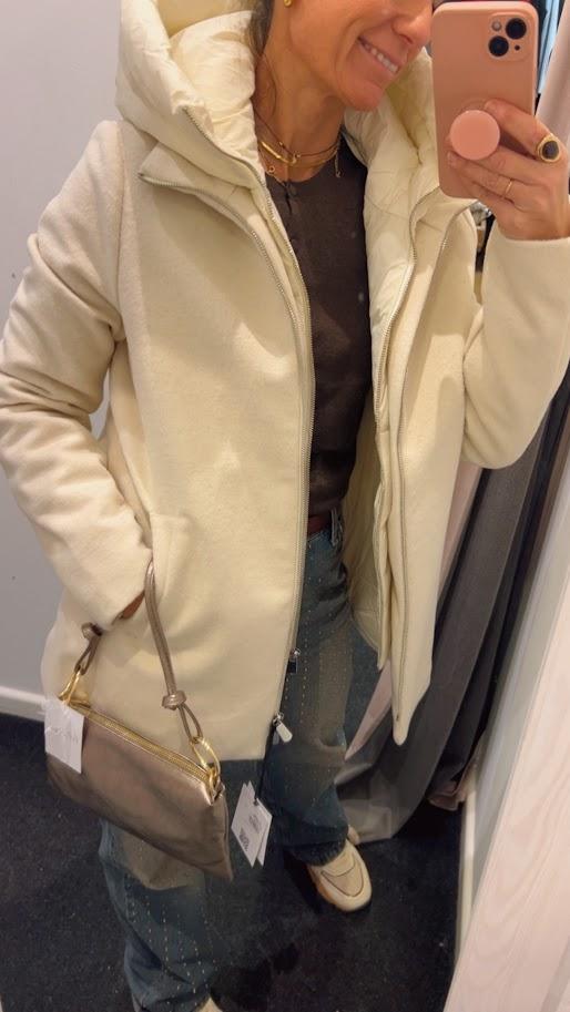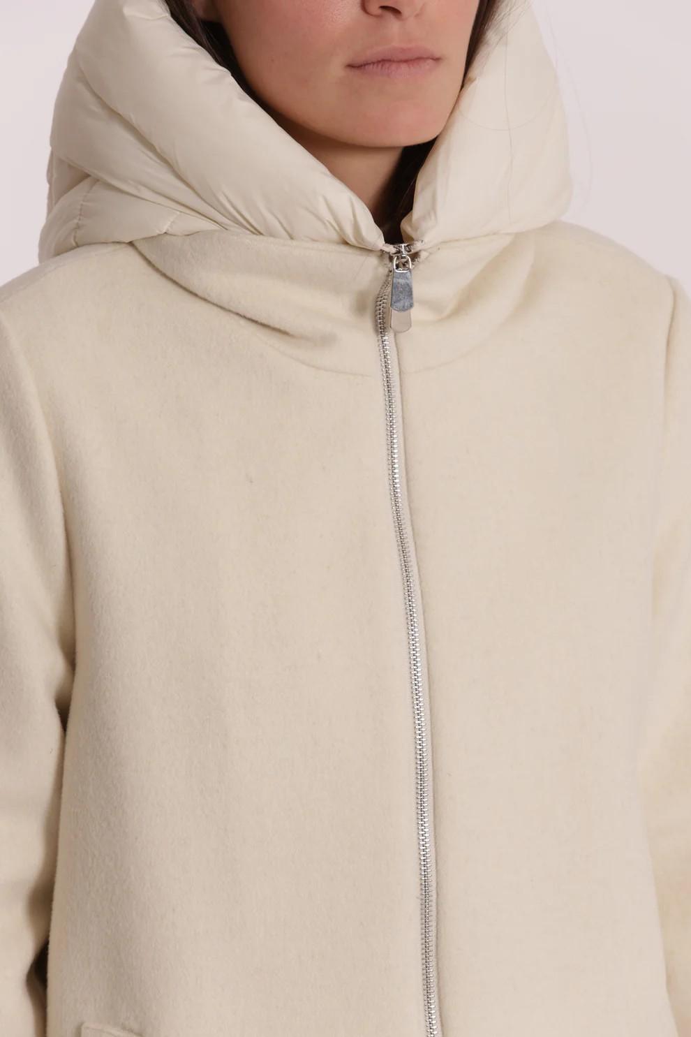 Abrigo color blanco roto, combinado con paño y plumas. Interior de plumas con capucha extraíble con cremallera. Marca Mimimua.