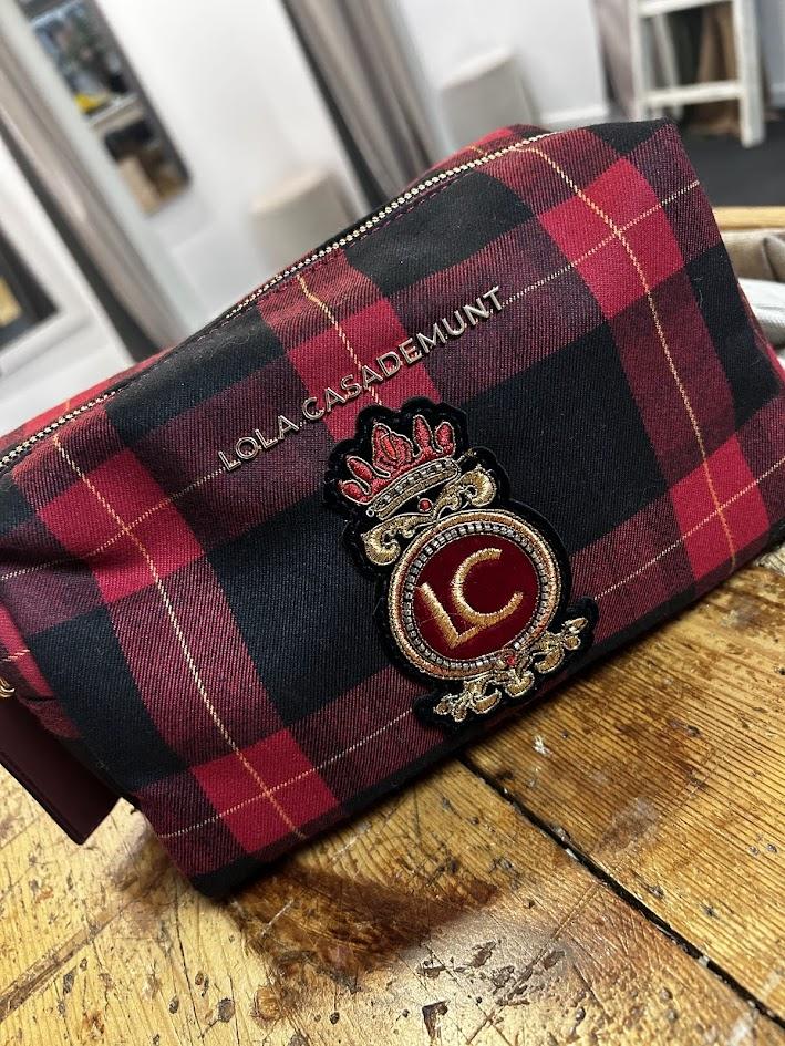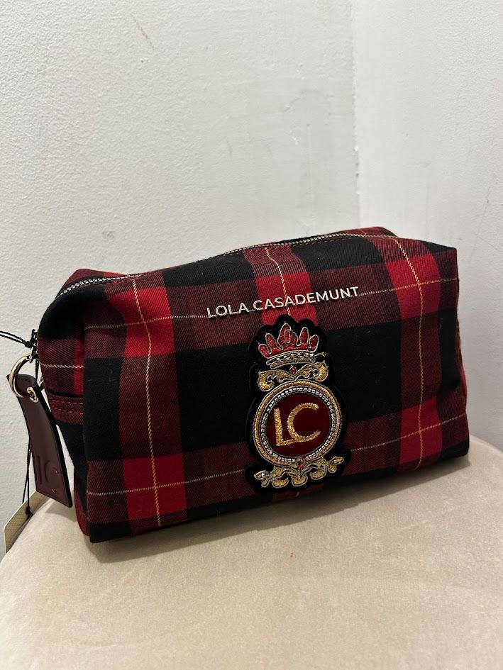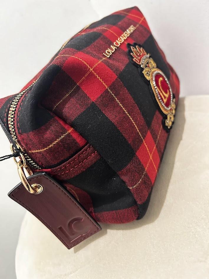 Neceser cuadros color negro y rojo. Detalle logotipo con dorado. Cierre cremallera. Marca Lola Casademunt.