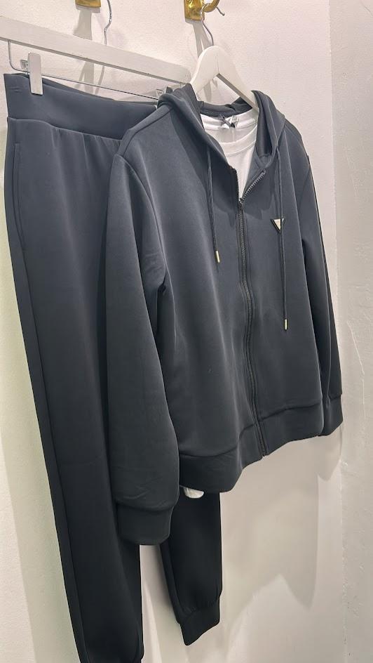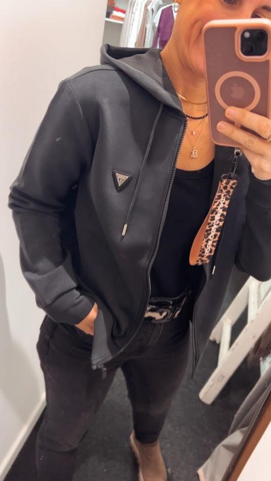 Sudadera suave con capucha y cremallera , tejido modal, manga larga, color negro. Corte recto. Moderno parche de logotipo. Marca Guess.