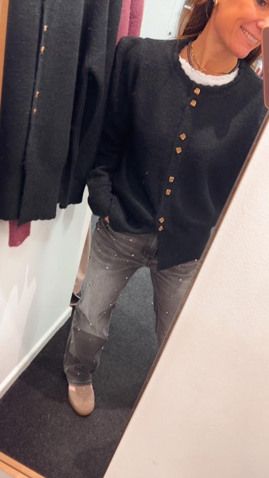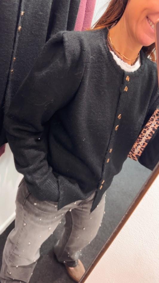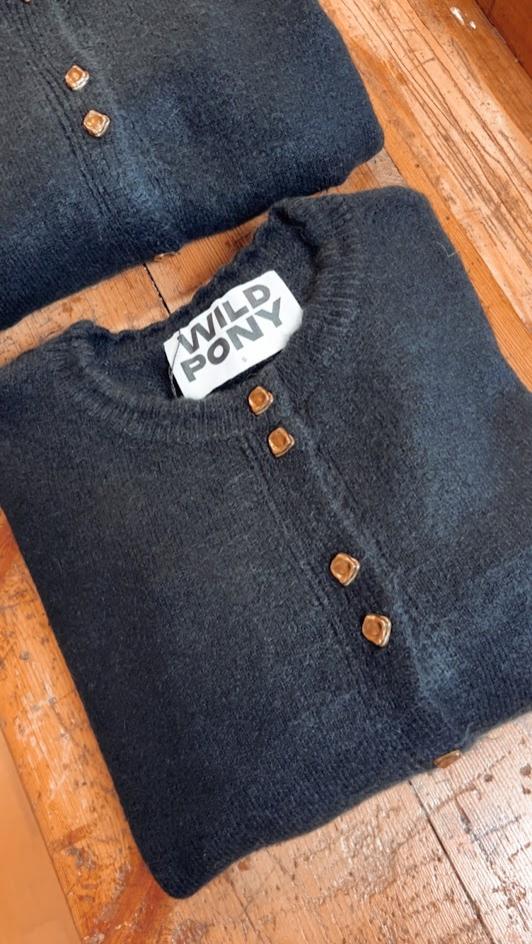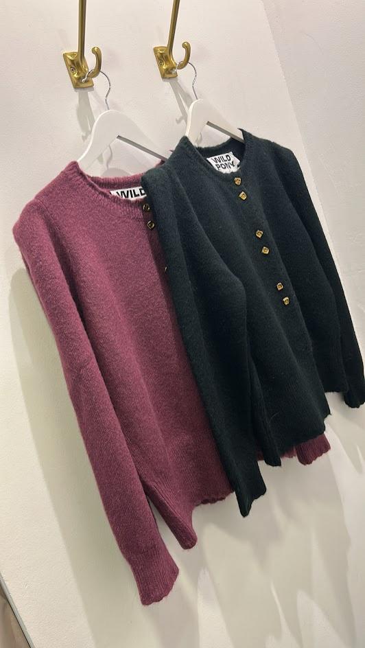 Cárdigan punto color morado o negro. Cuello redondo y manga larga con detalles en rib. Cierre con botones de joyas dorados. Marca Wildpony.