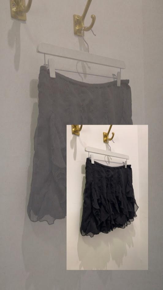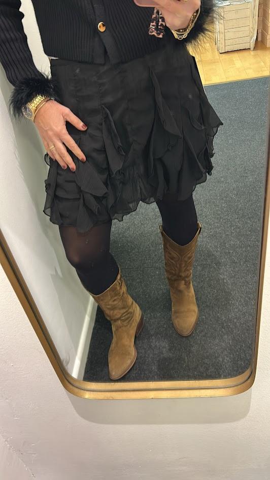 Minifalda de tejido chiffon de color negro. Cintura elástica fija de tiro medio con detalles en volantes. Forro interior.. Marca Wildpony.