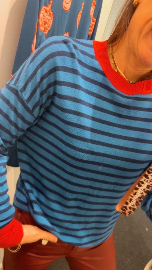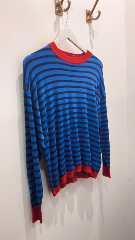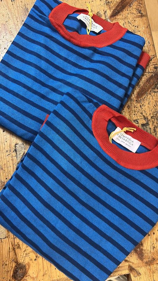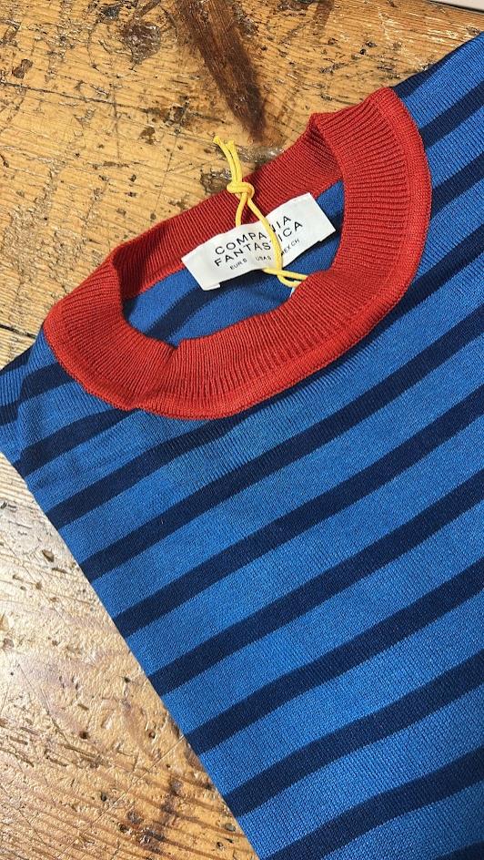 Jersey punto fino, con rayas combinadas en azul marino y azul, detalle de contraste en rojo en cuello, puños y bajo. Cuello redondo. Marca Compañía Fantástica.