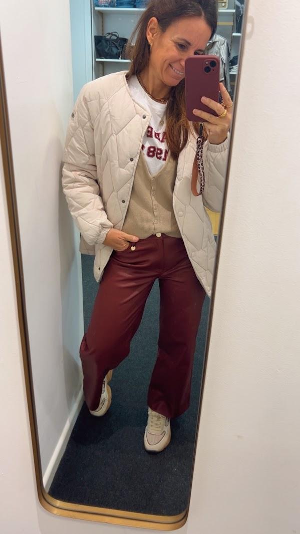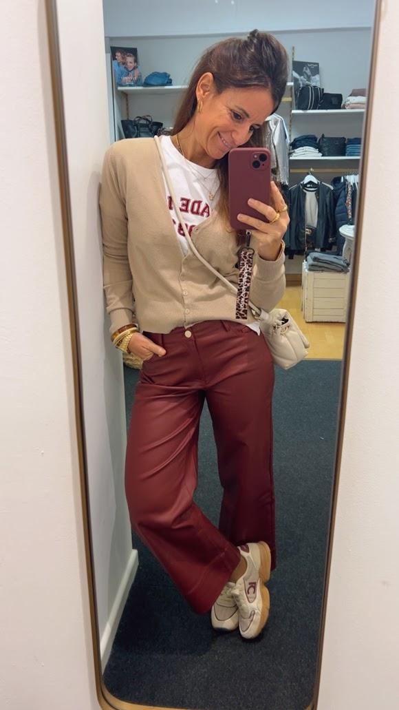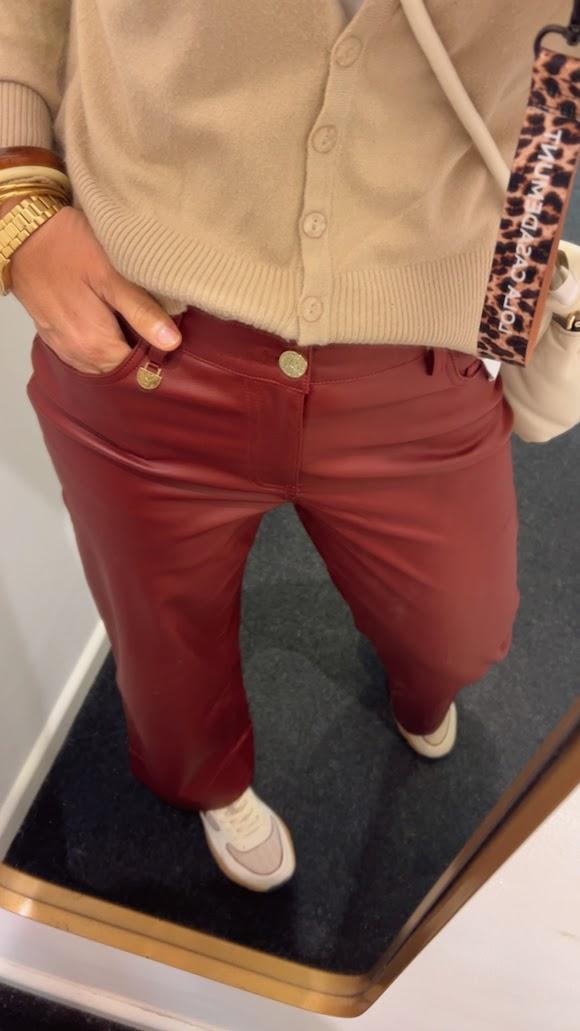 Pantalón color rojo efecto piel, cinco bolsillos tiro medio. Pata recta y cropped. Marca Lola Casademunt.