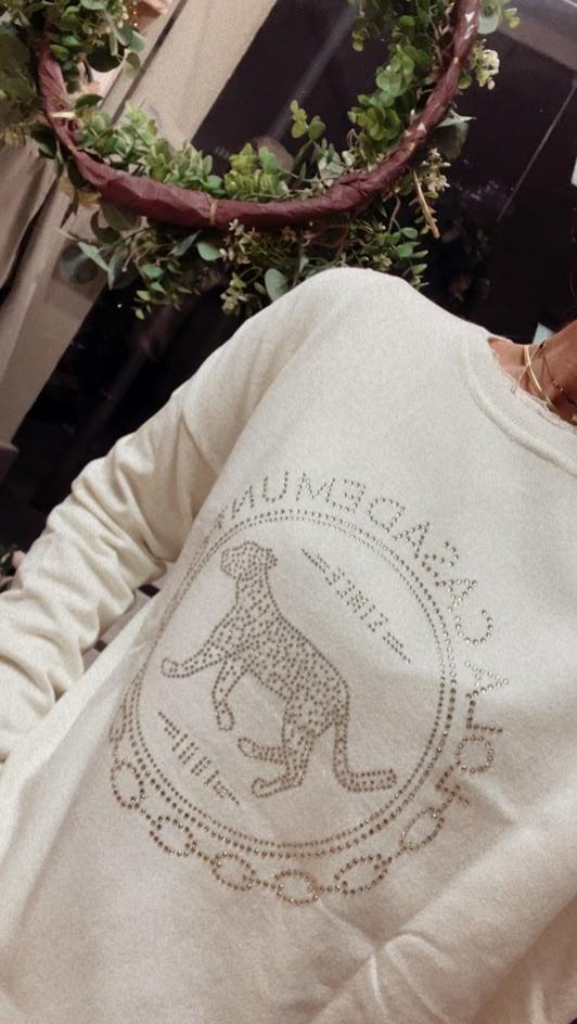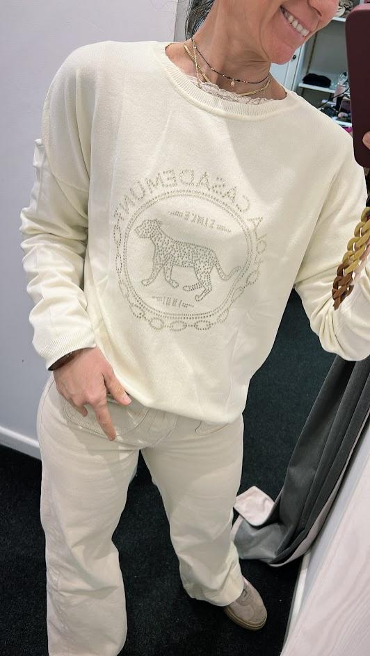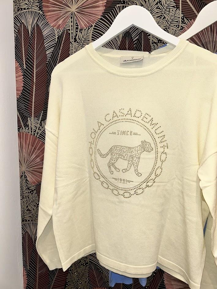 Jersei punto con rosco logo con strass. Color crudo. Cuello redondo, manga larga. Marca Lola Casademunt.