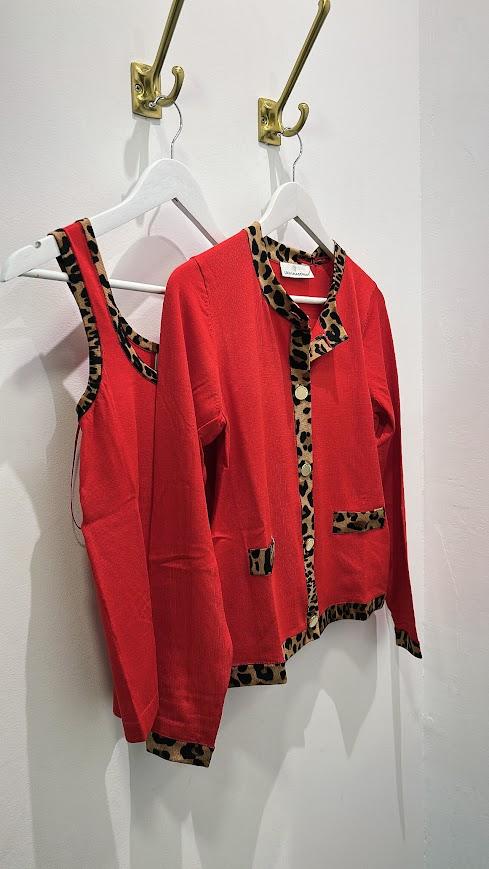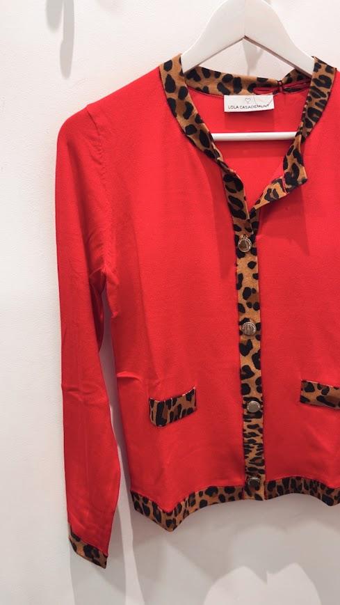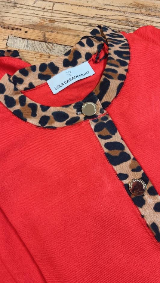 Chaqueta punto color rojo con rib contraste en animal print. Cuello redondo y cierre con botones. Marca Lola Casademunt.
