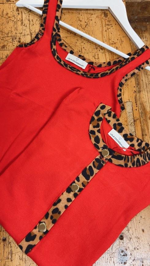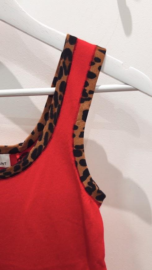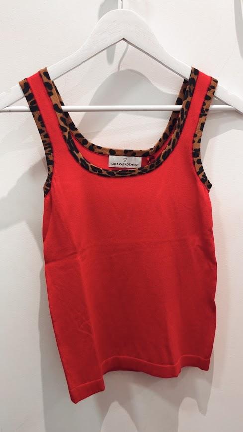 Top punto color rojo con rib contraste en animal print. Cuello redondo. Marca Lola Casademunt.