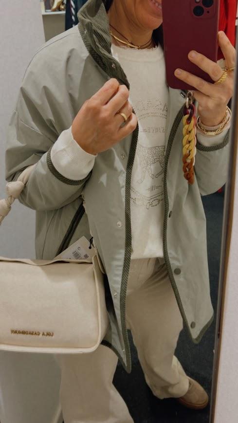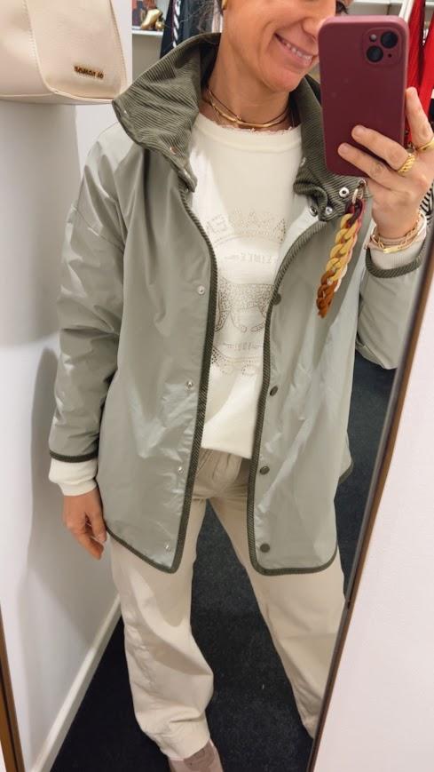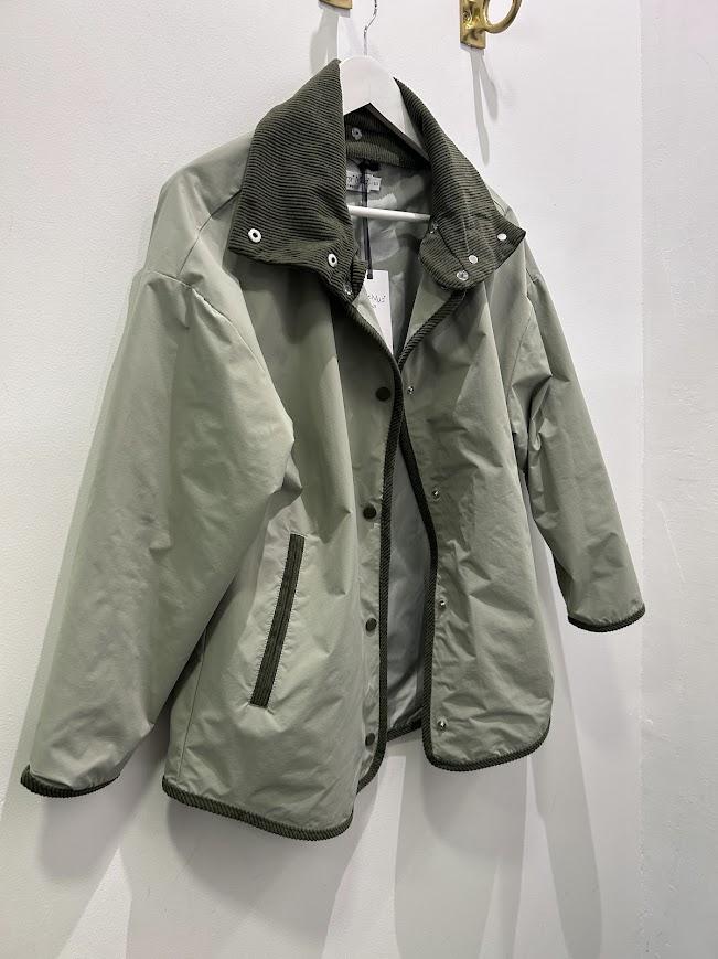 Chaqueta fina tipo parca, color verde, fina, y cierre con metalicos. Bolsillos laterales. Cuello pana verde extraible. Marca Mimimua.