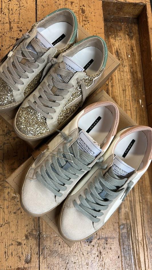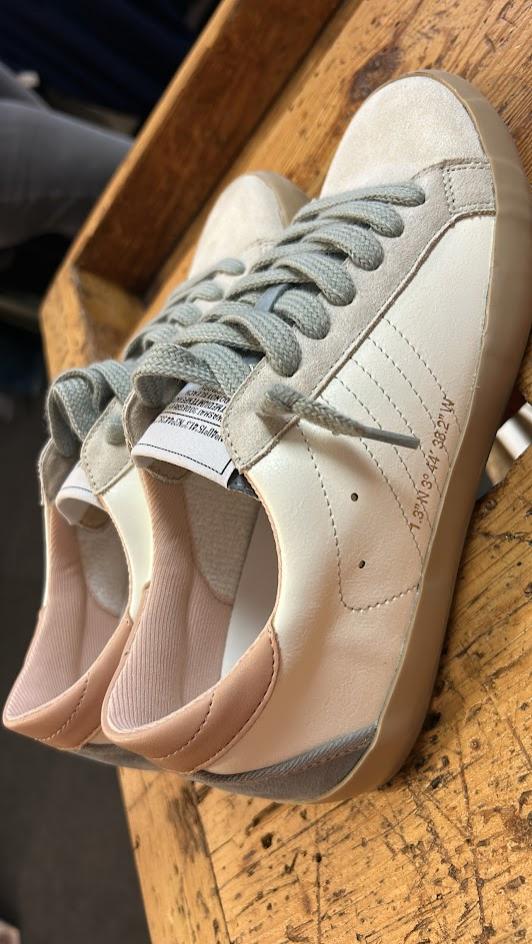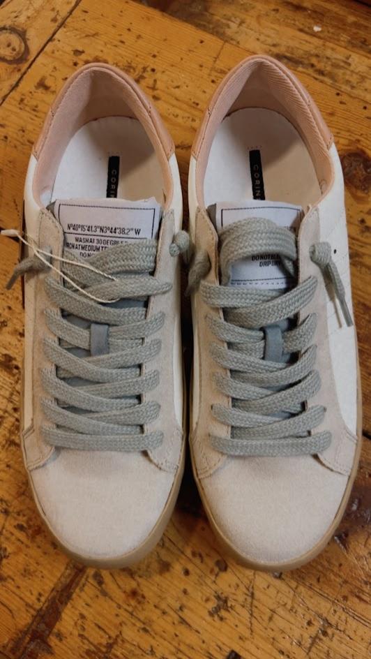 Zapatilla deportivas blancas con combinación en tono rosa y azul ciel . Cierre mediante cordones de siete pasadas.