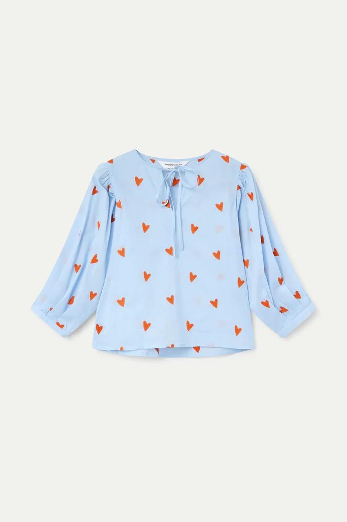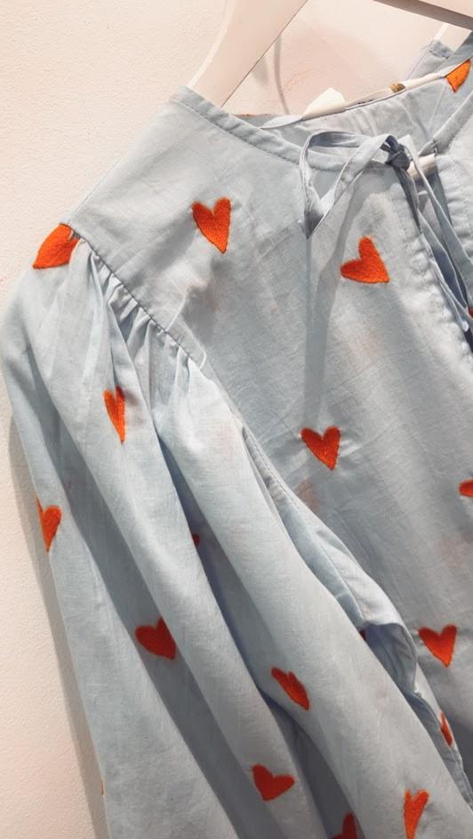 Top de tejido 100% algodón con bordado de corazones de color rojo. Cuello redondo con cordones y manga larga abullonada. Marca Compañía Fantastica.
